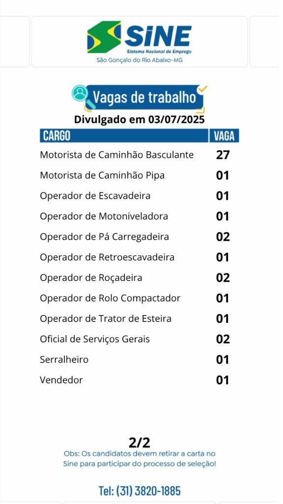 Médio Piracicaba Muitas vagas de emprego para está quinta-feira (03/07) no SINE São Gonçalo do Rio Abaixo (Boa sorte aos candidatos) 3 de julho de 2025 portaldomediopiracicaba@gmail.com Redação