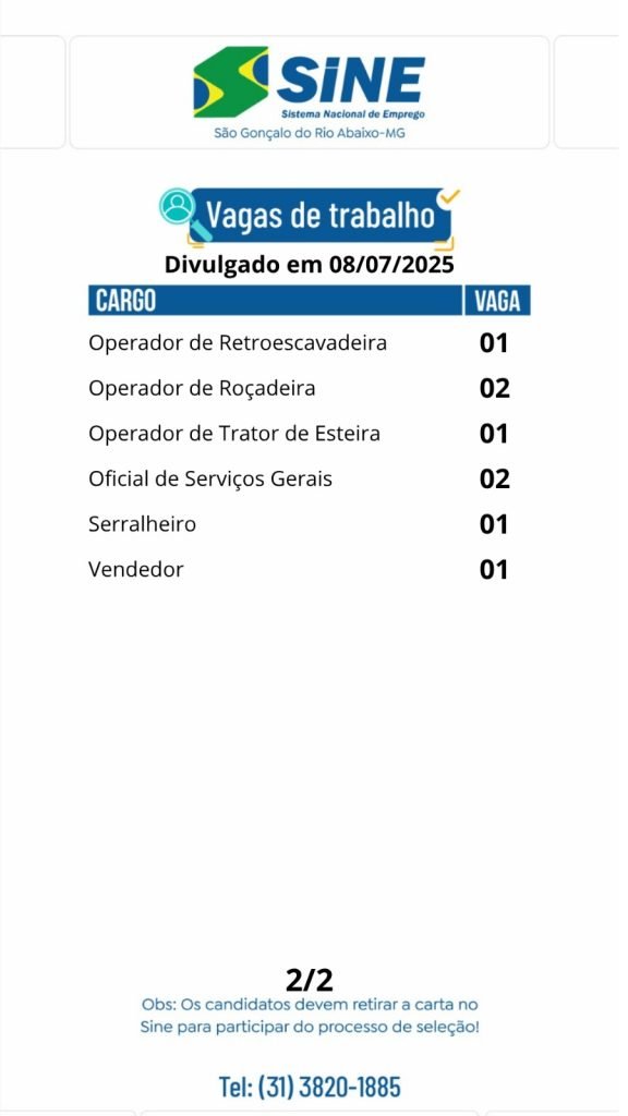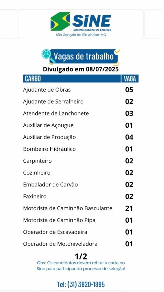 Médio Piracicaba Muitas vagas de emprego para hoje (08/07) no SINE São Gonçalo do Rio Abaixo (Boa sorte aos candidatos) 8 de julho de 2025 portaldomediopiracicaba@gmail.com Redação