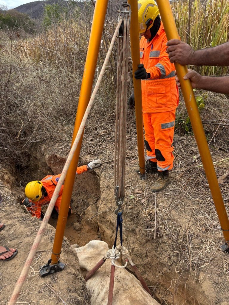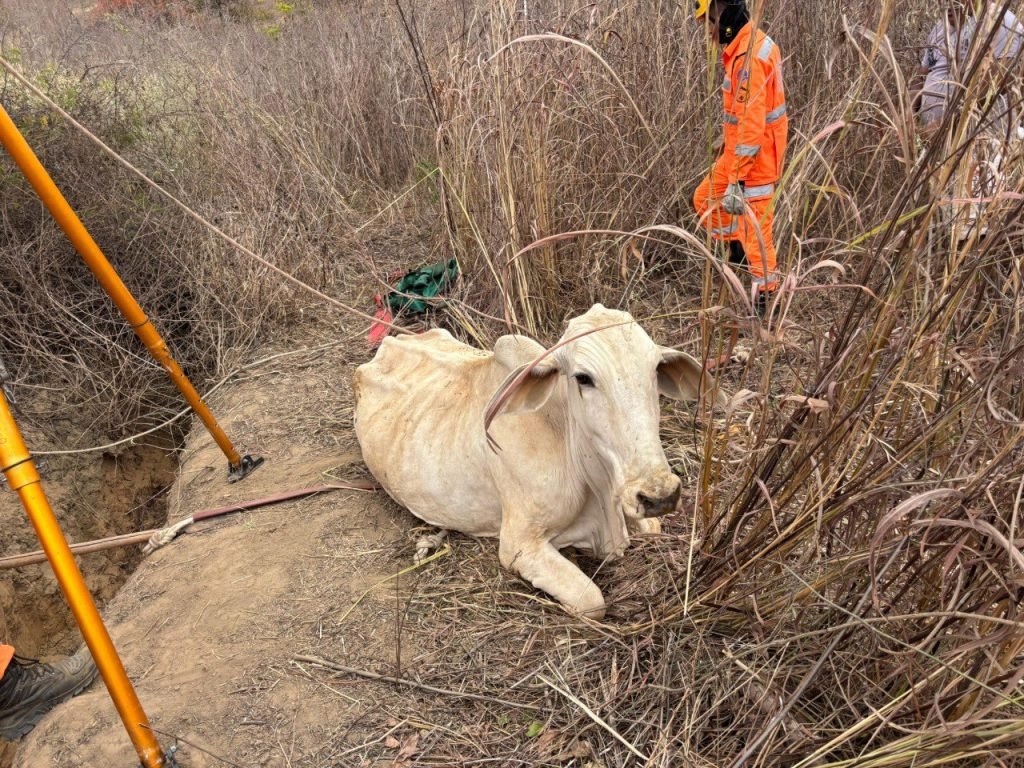 Foi montado um tripé de salvamento, com uso de equipamentos específicos de içamento, o que possibilitou a remoção bem-sucedida da vaca, que não apresentava ferimentos aparentes.