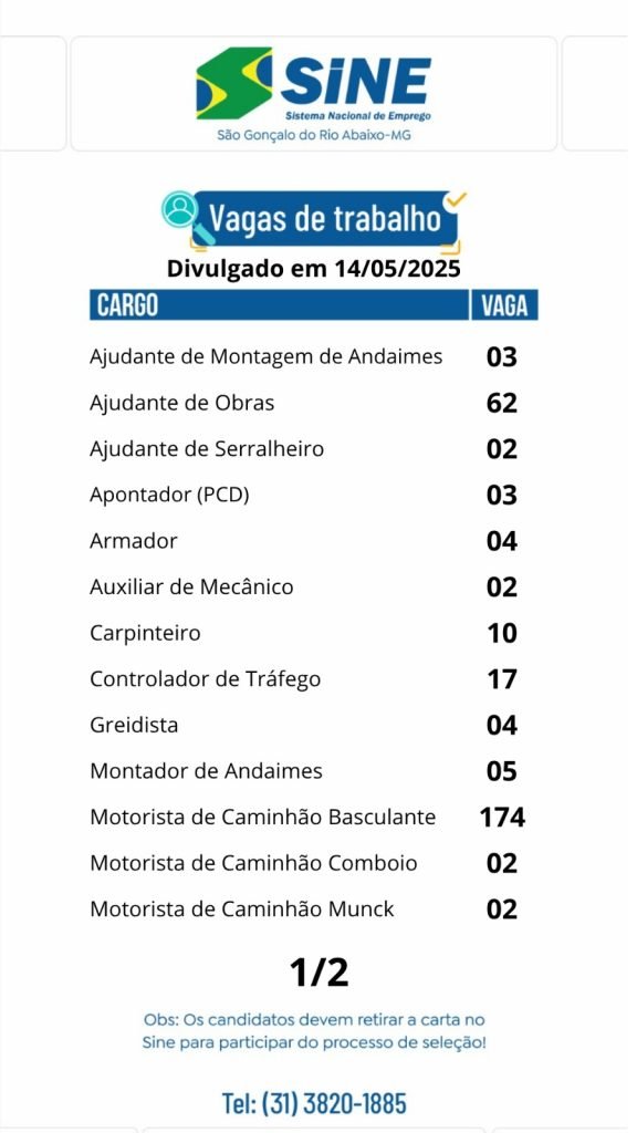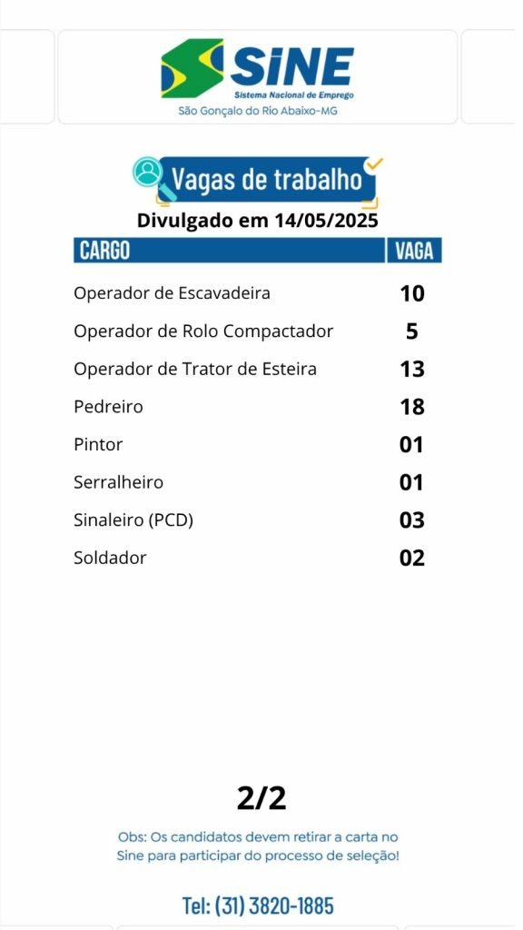 345 vagas de emprego para hoje no SINE São Gonçalo do Rio Abaixo