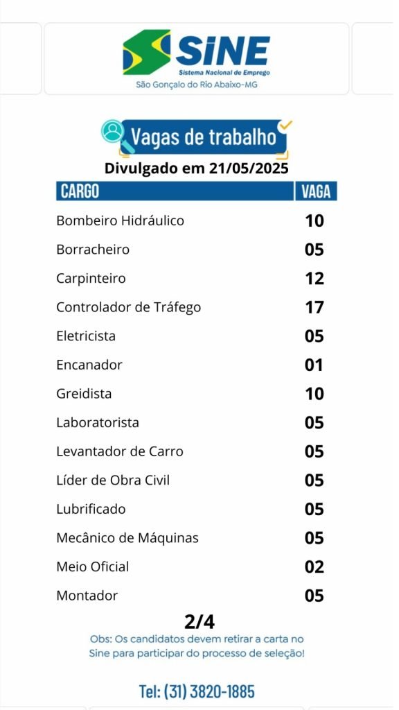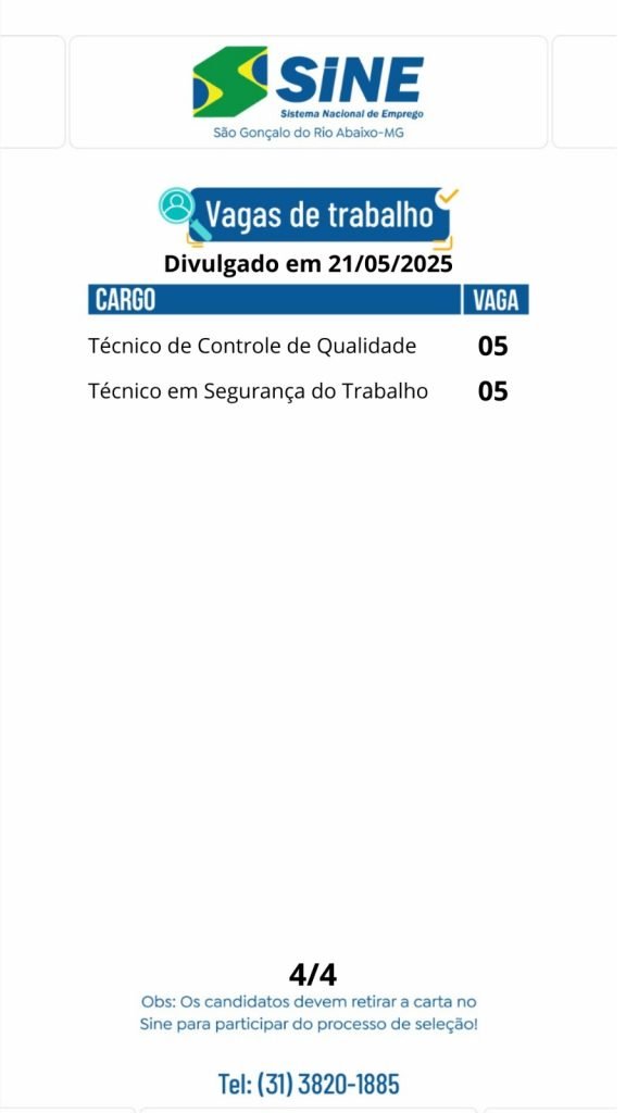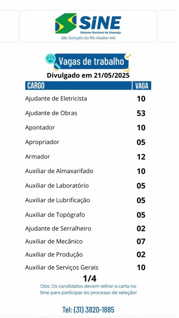 Mais de 450 vagas de emprego no SINE São Gonçalo do Rio Abaixo para está quarta-feira (21/05) Boa sorte aos candidatos