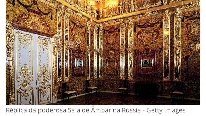 A Sala de Âmbar, conhecida como a “Oitava Maravilha do Mundo”, foi uma câmara luxuosa criada na Prússia no início do século XVIII, composta por mais de 6 toneladas de âmbar, folhas de ouro e espelhos, decorando o Palácio de Catarina, na Rússia. Foi saqueada pelos nazistas em 1941 e desapareceu em 1943/1944 no final da Segunda Guerra Mundial, tornando-se um dos maiores mistérios de arte perdidos.