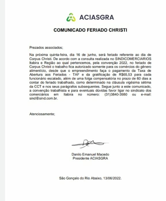 Geral ACIASGRA Feriado de Corpus Christi (16/06) 14 de junho de 2022 portaldomediopiracicaba@gmail.com Redação