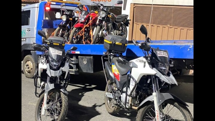 Foram constatadas diversas infrações de transito durante a fiscalização, como condutor inabilitado, motocicleta com caracteristica alterada e placa em desacordo com a regulamentação do CONTRAN.