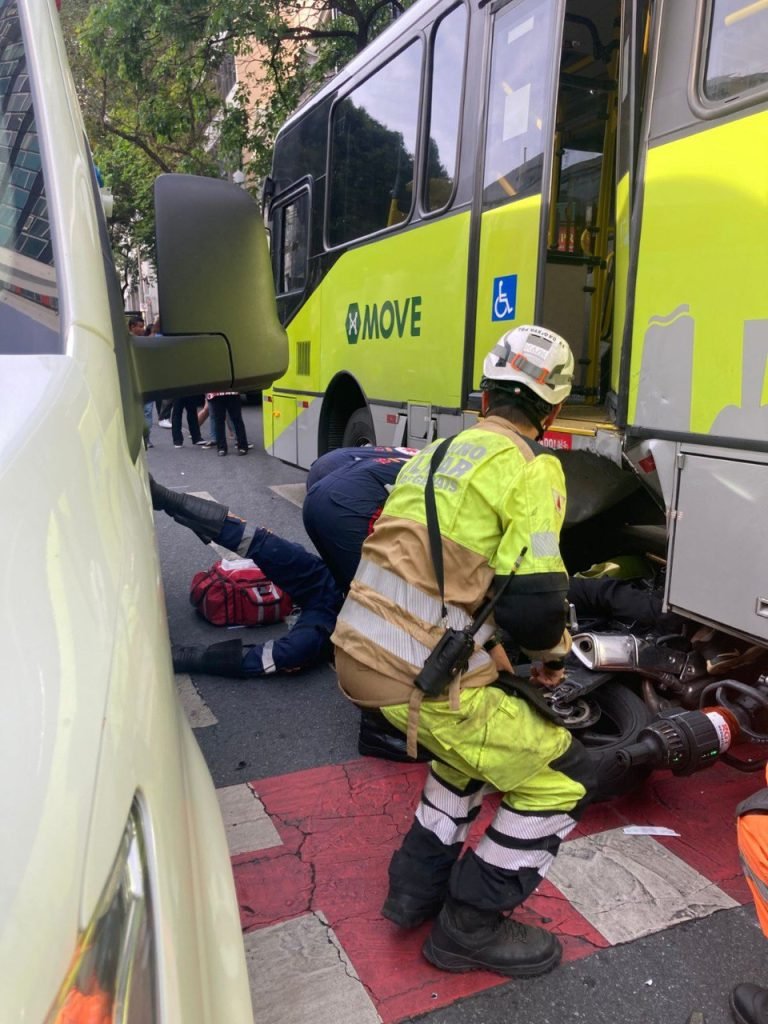Bombeiros acionados nesta manhã (6), por volta das 6h, para atendimento de uma colisão entre ônibus e moto na avenida João Pinheiro, no bairro Lourdes.