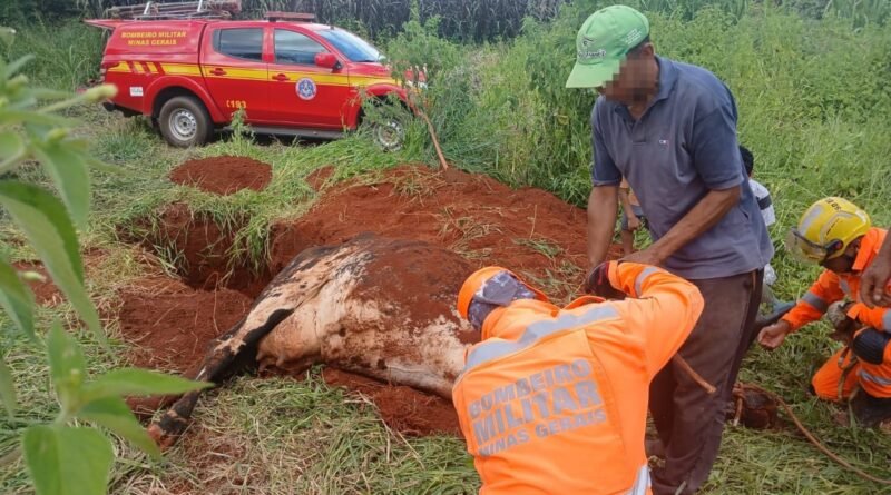 No local, tratava-se de uma vaca que havia caído em uma cisterna em construção, com 3 metros de profundidade.