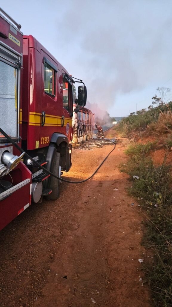 BOMBEIROS ATENDEM OCORRÊNCIA DE INCÊNDIO EM ÔNIBUS DE TIME DE FUTEBOL NA RODOVIA MG-214