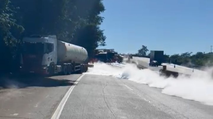 No local, há grande volume de fumaça branca e densa proveniente do caminhão. Polícia Rodoviária Federal no local e Polícia Científica acionada para realizar os trabalhos de praxe.