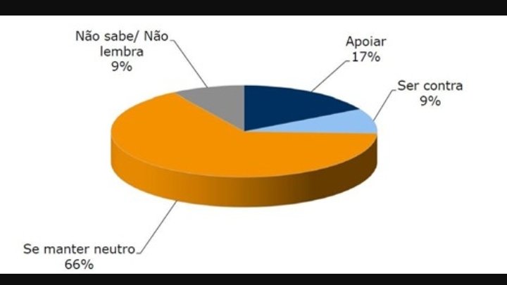 Quando questionados sobre como o Brasil deveria se posicionar, a resposta é contundente: dois em cada três brasileiros (66%) defendem que o país se mantenha neutro, ao passo que 17% acreditam que o Brasil deveria apoiar a ação militar, e 9% que deveria ser contra. Os que não sabem ou não respondem à pergunta somam 9%.