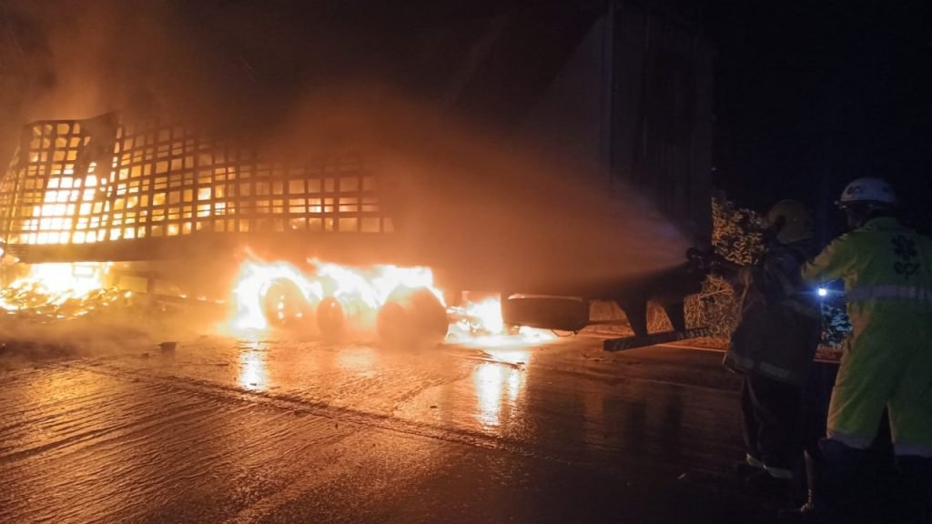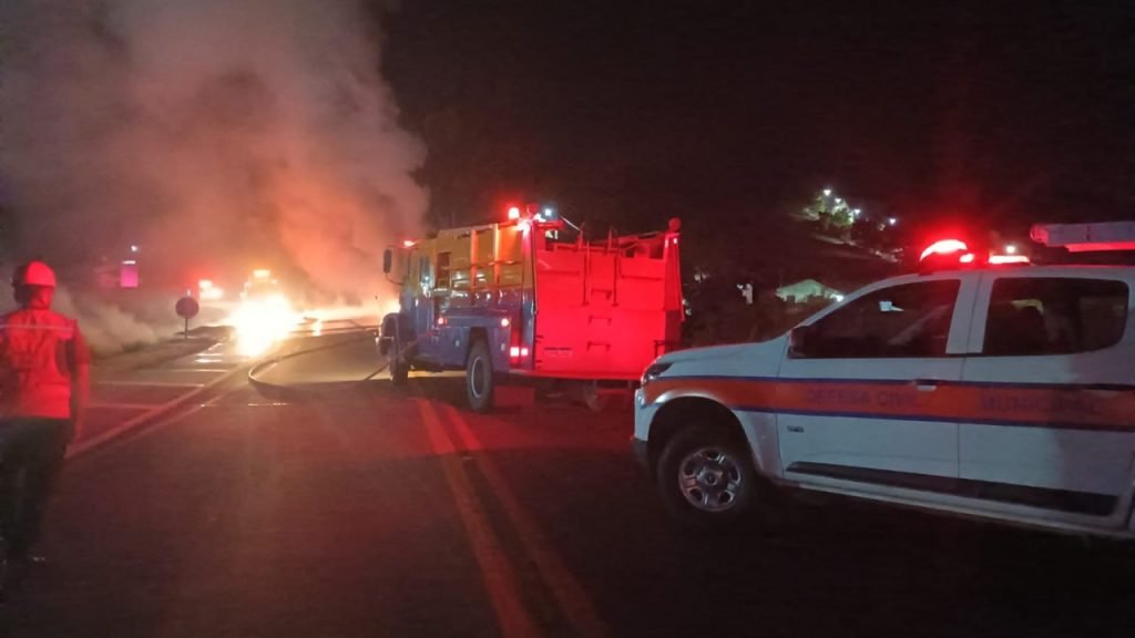 No local, constatou-se uma colisão entre uma carreta que transportava cosméticos e uma motocicleta. Com o forte impacto, o veículo de carga incendiou-se rapidamente, sendo completamente consumido pelas chamas.