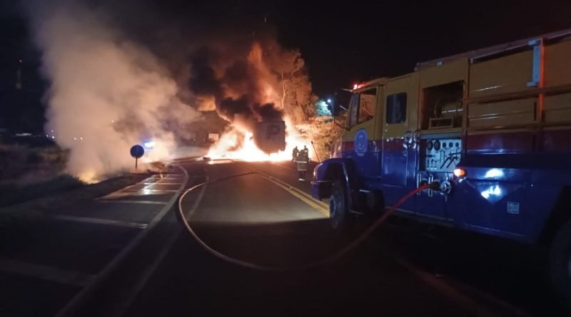 No local, constatou-se uma colisão entre uma carreta que transportava cosméticos e uma motocicleta. Com o forte impacto, o veículo de carga incendiou-se rapidamente, sendo completamente consumido pelas chamas.