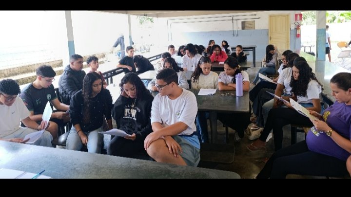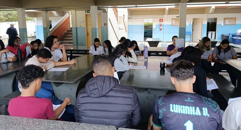 Durante a dinâmica, os alunos Fábio e Pedro simularam formas de comunicação utilizadas por pessoas com deficiência total ou parcial na fala, enquanto os demais colegas tentavam compreender a mensagem e oferecer apoio.