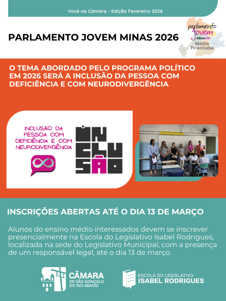 A Casa Legislativa divulga o informativo “Você na Câmara”, que reúne os principais destaques: projetos, indicações e moções aprovadas, campanhas apoiadas pela Casa, os atendimentos realizados pelo CAC e pelo Procon, além das ações desenvolvidas pelo Parlamento Jovem Minas.