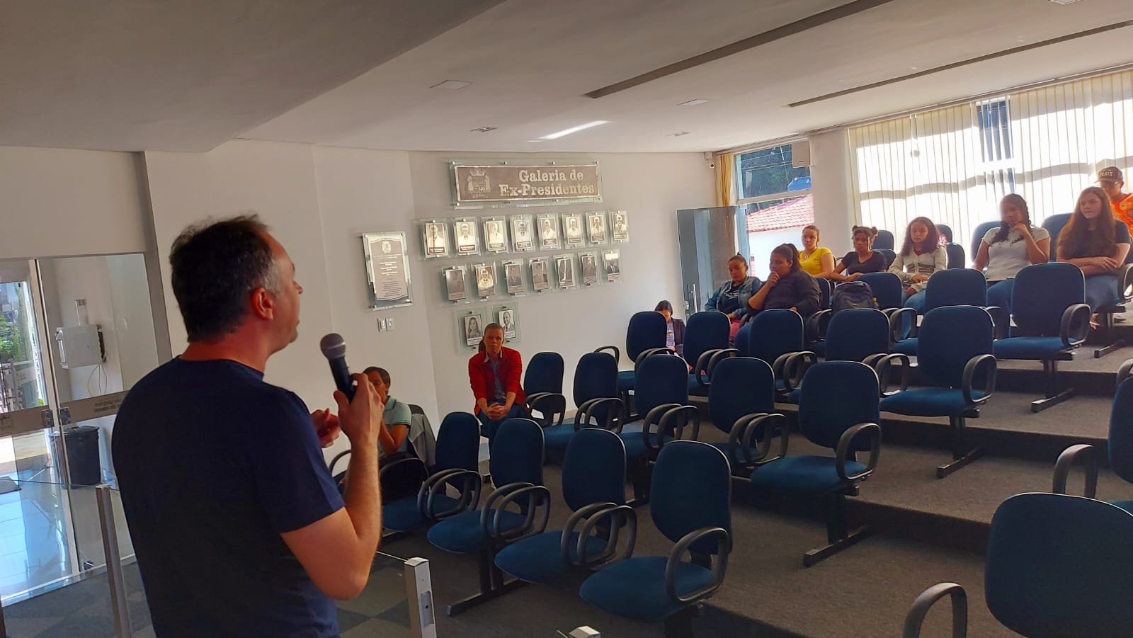 Palestra a jovens integrantes do Parlamento Jovem da Câmara, ministrada pelo coordenador do Sine, Breno Aranda.