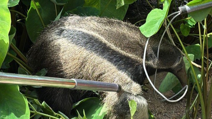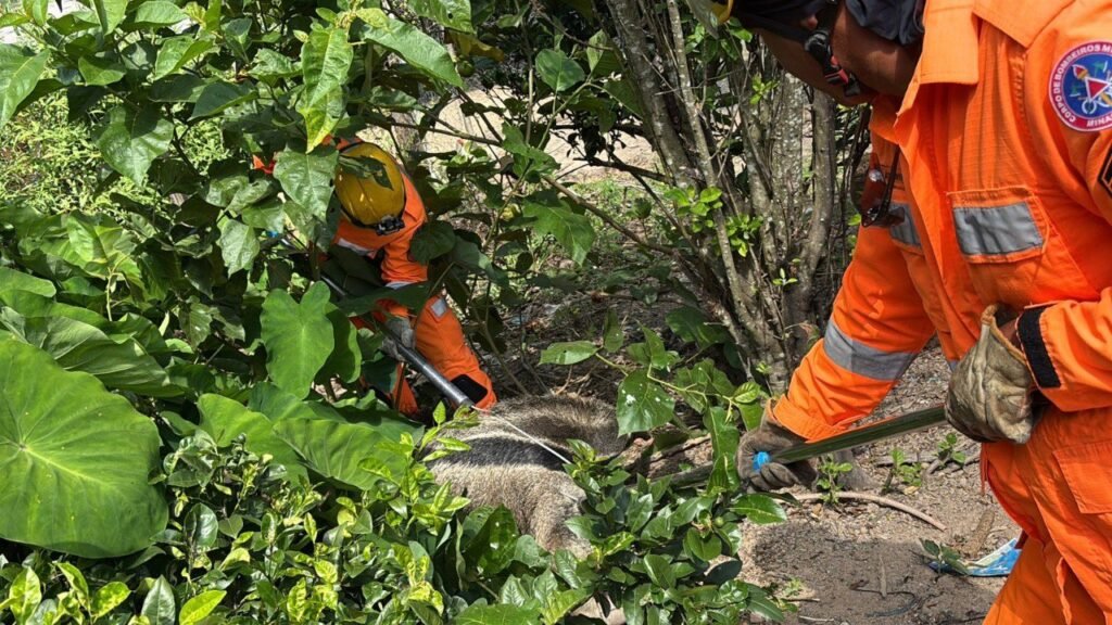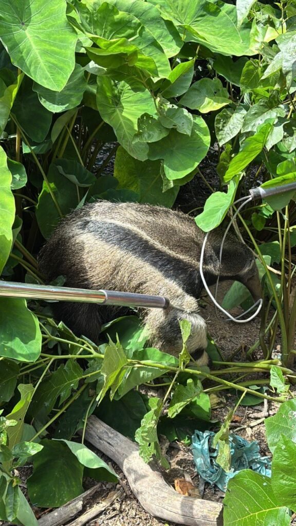 Após a intervenção, o tamanduá foi devolvido ao seu habitat natural, em área de mata adequada.