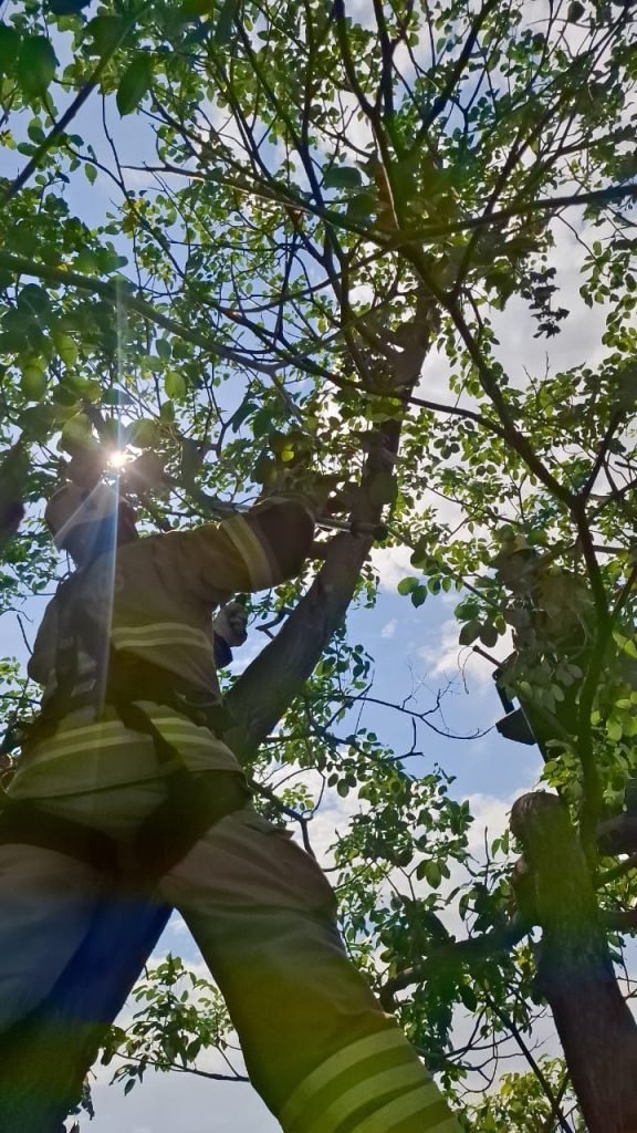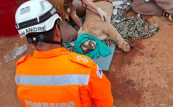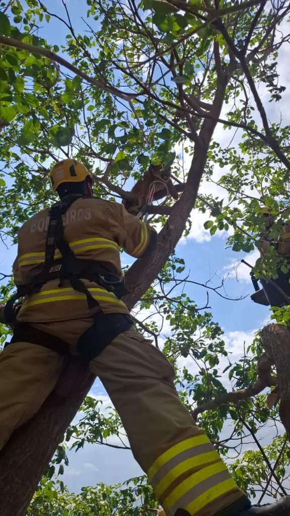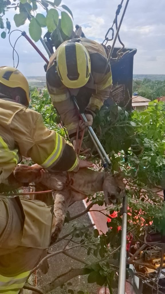 Onde nesta terça-feira, o Corpo de Bombeiros Militar de Minas Gerais resgatou uma onça Parda que estava sob a copa de uma árvore.