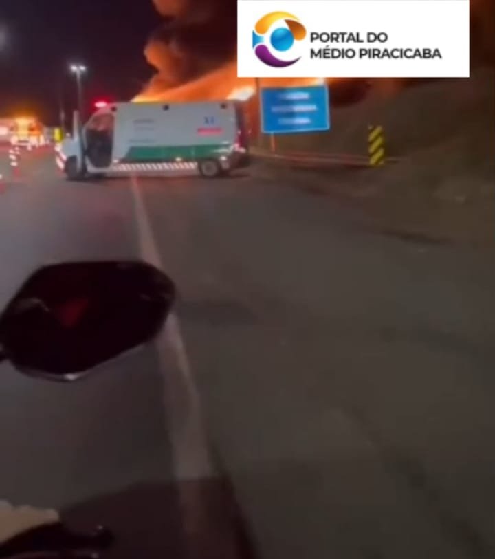 Incêndio em bitrem tipo baú na altura do KM 499, próximo à base da Concessionária Arteris, que se encontra sinalizando o trecho.