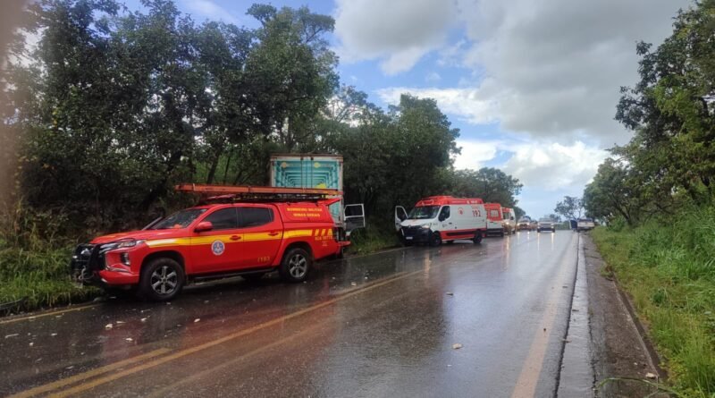 Colisão entre dois caminhões e uma caminhonete na MGC-410 com vítima fatal presa às ferragens