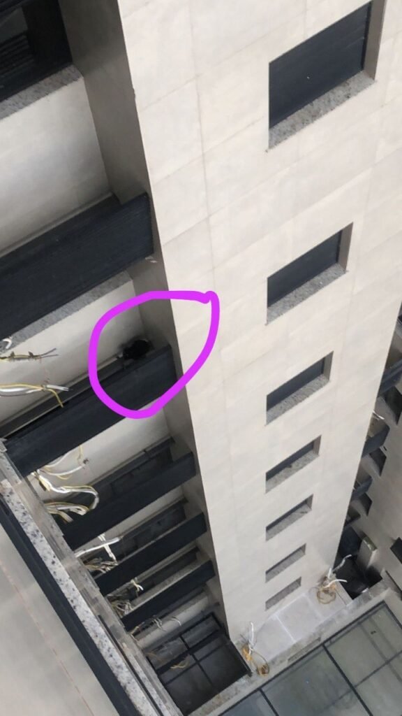 Na noite desta segunda-feira (20), Bombeiros foram acionados para uma ocorrência delicada: um gato havia caído do décimo andar de um prédio e ficou preso no sétimo andar, em um vão da estrutura (anteparo do ar condicionado).