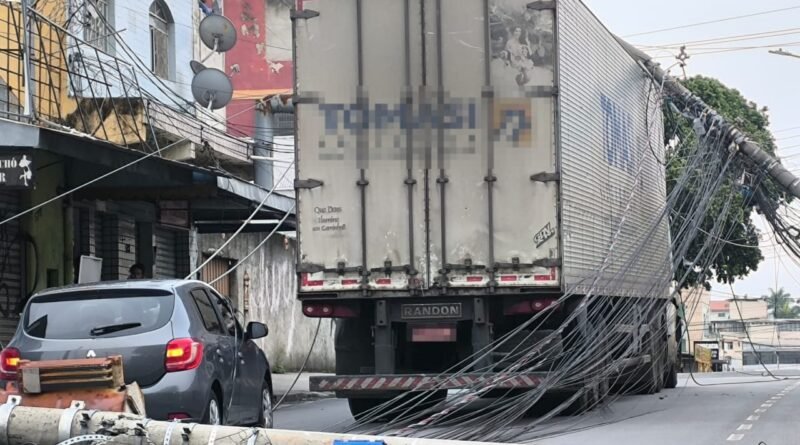 Segundo informações, um caminhão teria passado pelo local arrastando a fiação, vindo na sequência derrubar dois postes. Os postes caíram sobre dois veículos, e os fios ficaram sobre o caminhão.