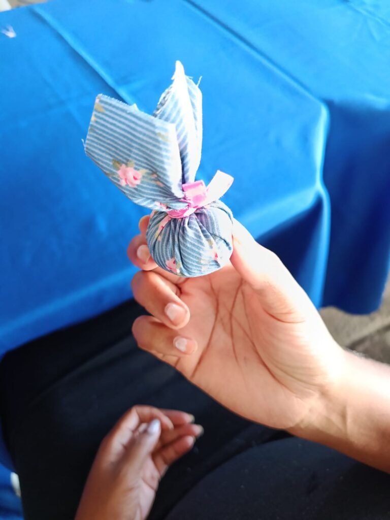 Durante a oficina, os participantes tiveram a oportunidade de aprender a confeccionar sachês perfumados, atividade conduzida pela artesã Raquel Aparecida dos Santos, proprietária da Fábrica de Fofuras. Além de apresentar a história dos sachês, ela orientou cada etapa da produção, tornando o momento ainda mais interativo e significativo.