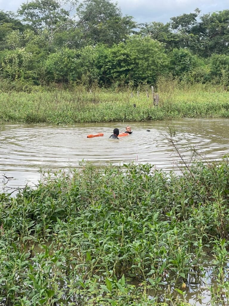 Ao retornar no local, a guarnição localizou o corpo do afogado, que se encontrava parcialmente submersa, às margens da lagoa.