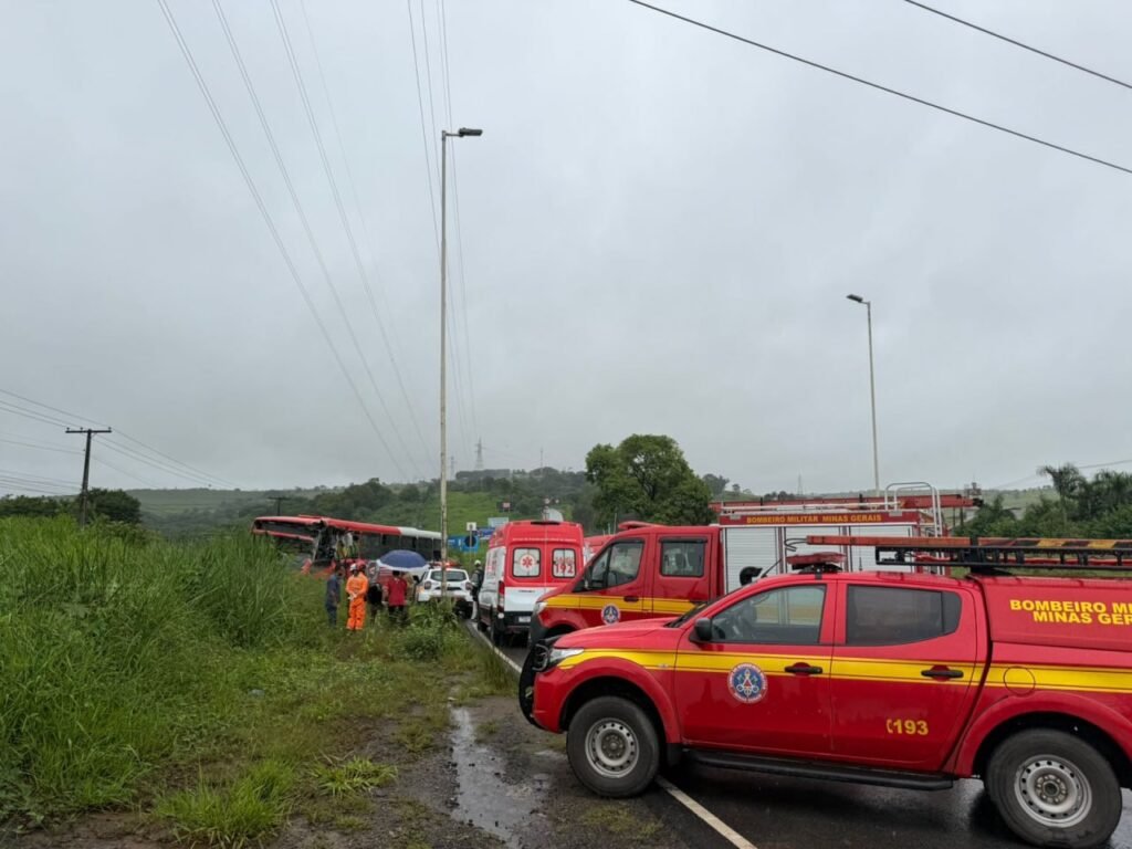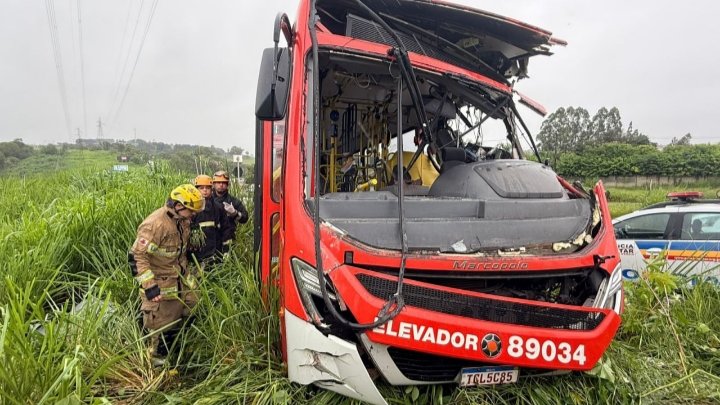 Militares do Corpo de Bombeiros foram acionados para comparecer ao local. O ônibus capotou e caiu no mato às margens da rodovia.