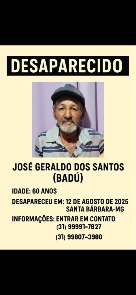 Saiu de Itabira, sem dinheiro, em direção a São Gonçalo do Rio Abaixo com destino a Santa Bárbara, más simplesmente desapareceu e não chegou ao seu lar, a família está desesperada com o desaparecimento do senhor José Geraldo dos Santos.