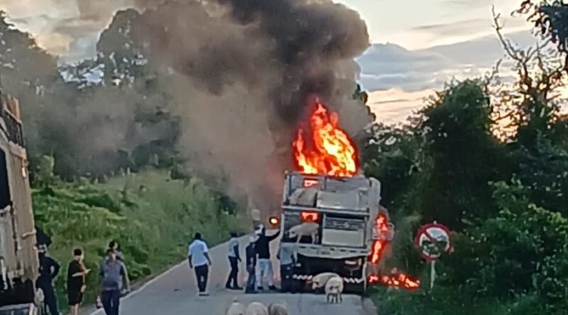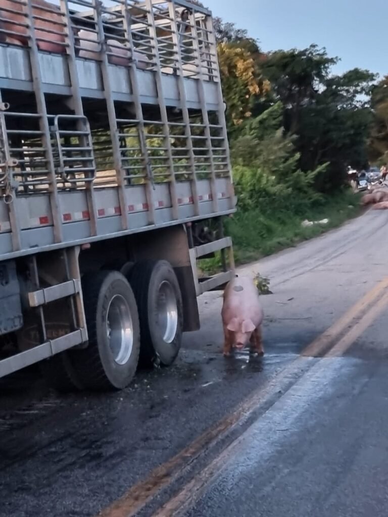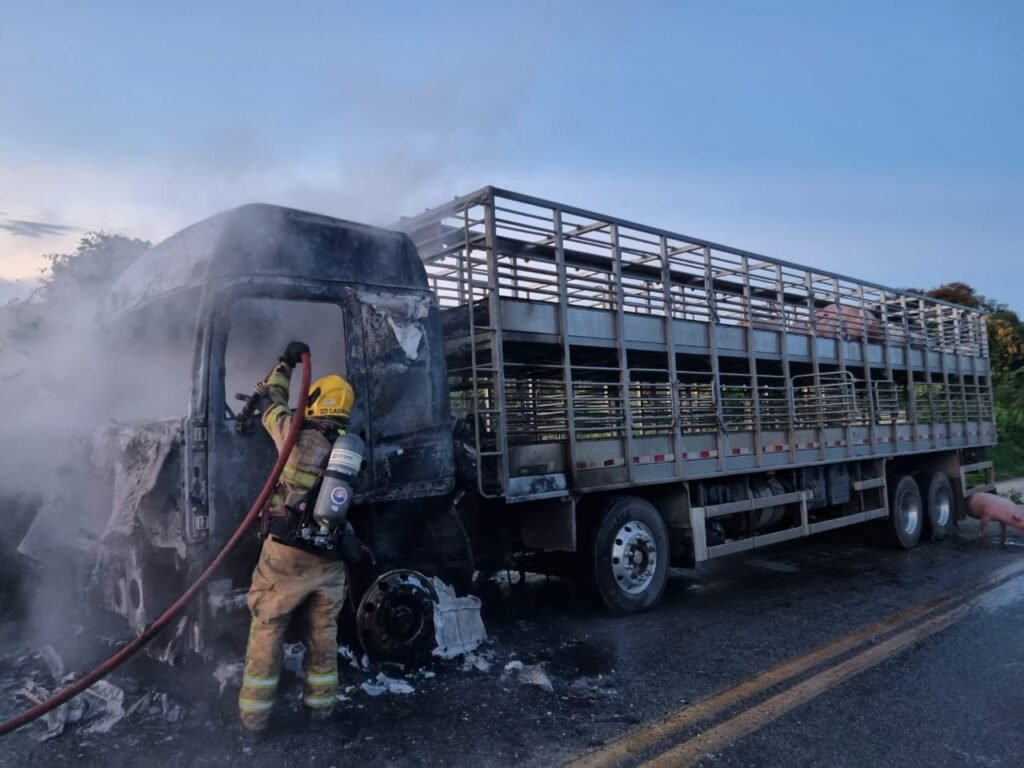 Incêndio atinge caminhão que transportava porcos na MGC-383