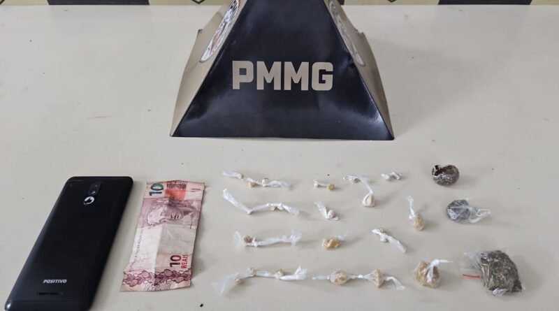 Durante busca pessoal, foram localizadas pedras de crack e buchas de maconha fracionadas e embaladas, prontas para a comercialização, além de um aparelho celular e dinheiro em espécie. O autor relatou que realizaria a entrega da droga em outro bairro da cidade.