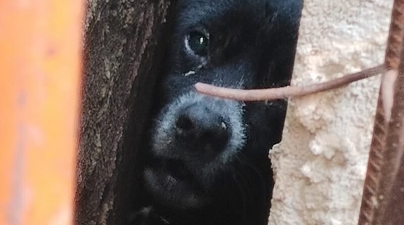 Um cão de médio porte, sem raça definida (SRD), encontrava-se preso entre o muro da residência da solicitante e a parede do imóvel vizinho.