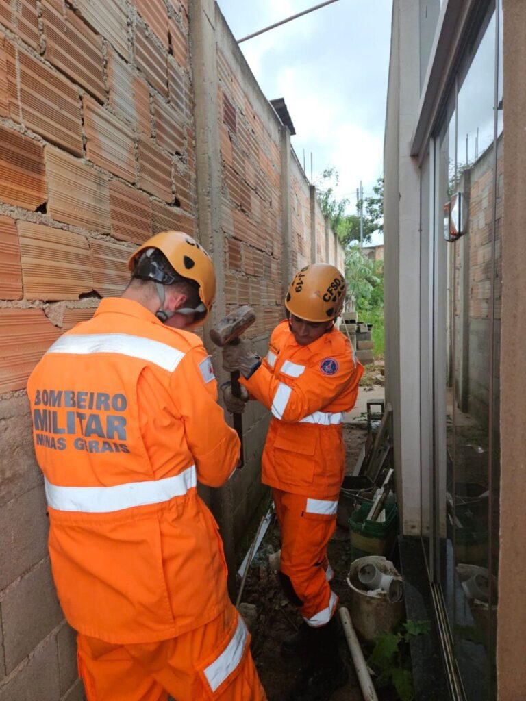 Com autorização da proprietária da residência, a guarnição realizou a quebra de cerca de 1 metro quadrado do muro, possibilitando o resgate seguro do cão.