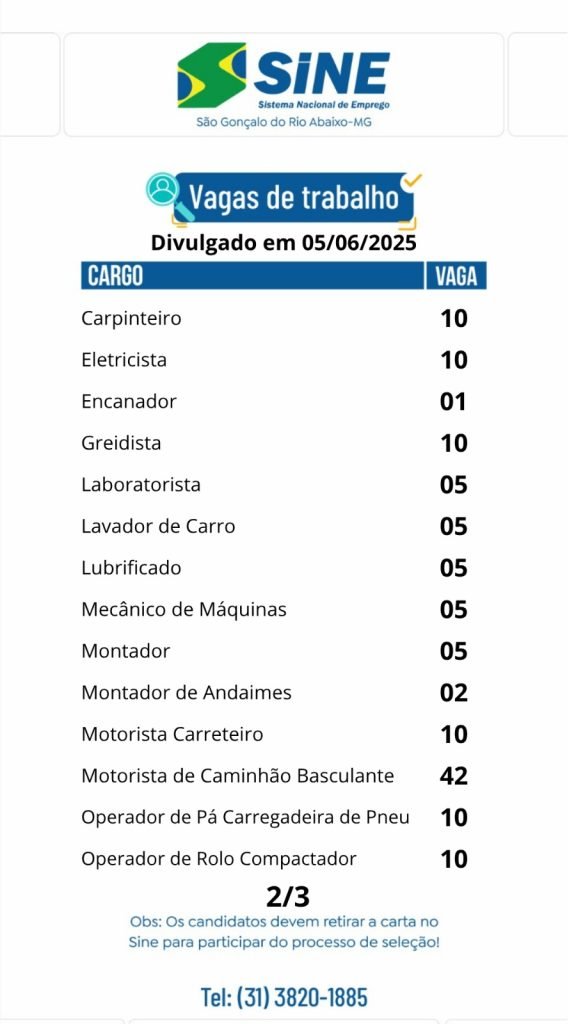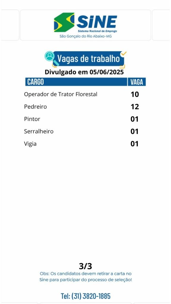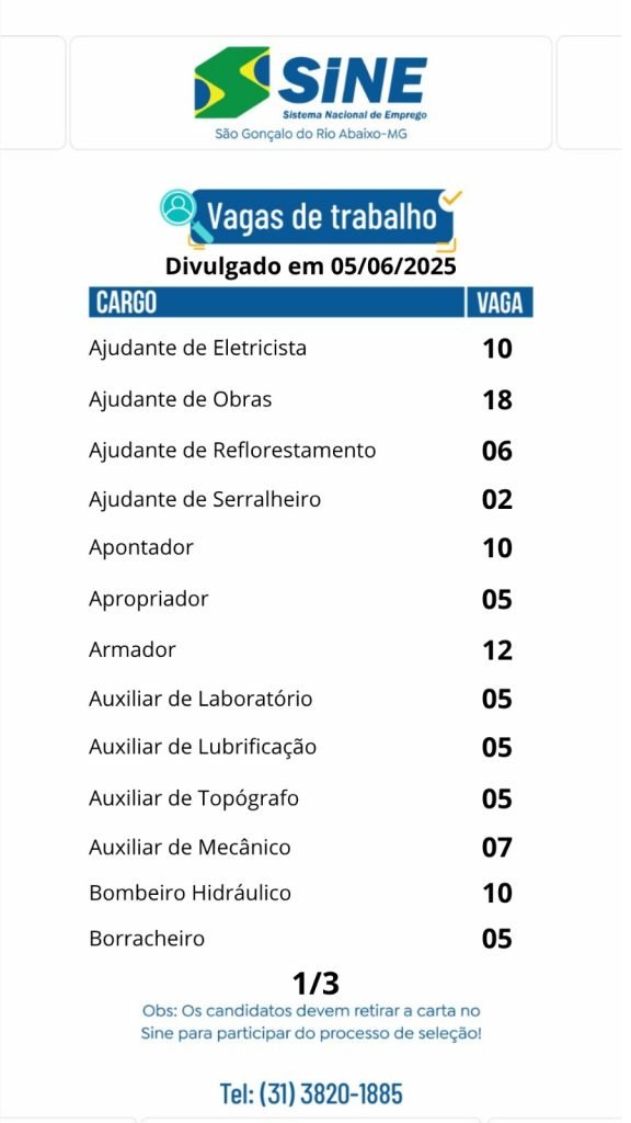 Mais de 250 vagas para hoje (05/06) no SINE São Gonçalo do Rio Abaixo (Boa sorte aos candidatos)