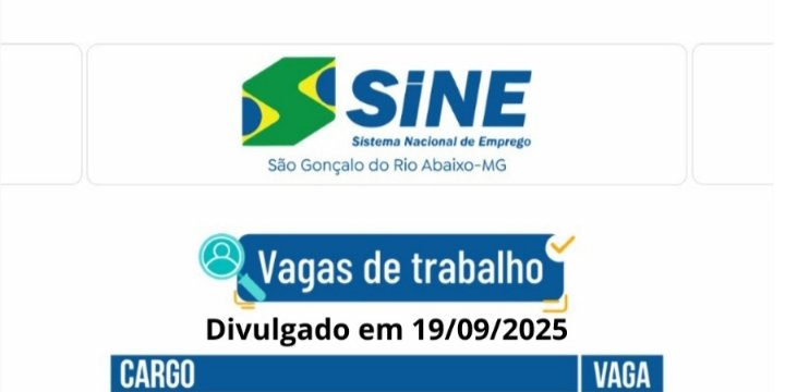 Médio Piracicaba Mais de 260 vagas de emprego para hoje no SINE São Gonçalo do Rio Abaixo (#boasorte) 19 de setembro de 2025 portaldomediopiracicaba@gmail.com Redação