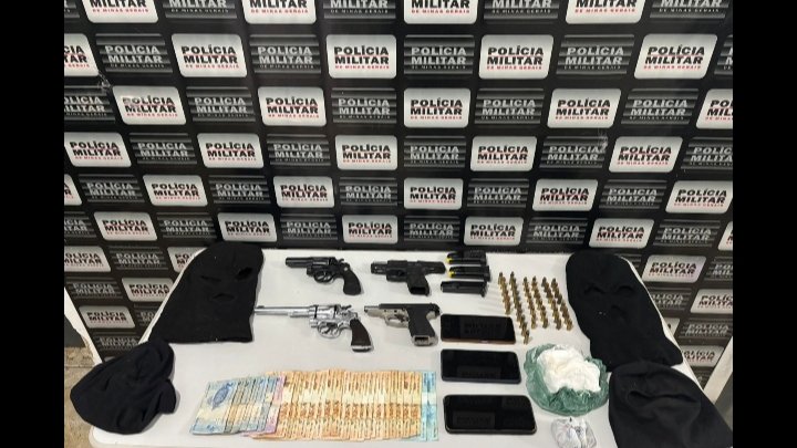 No imóvel utilizado pelos autores em Matipó, foram apreendidos os seguintes materiais: 02 revólveres calibre .38, 01 pistola calibre 9 mm, 01 pistola calibre .380, 24 munições calibre 9 mm, 08 munições calibre .380, 16 munições calibre .38, 03 carregadores de arma de fogo, 01 barra de cocaína, 01 tablete de maconha, 04 toucas tipo ninja, 01 pacote de embalagens plásticas, 03 aparelhos celulares, R$ 1.217,00 em moeda corrente, 01 relógio, roupas e calçado, além de diversos documentos e registros em redes sociais.