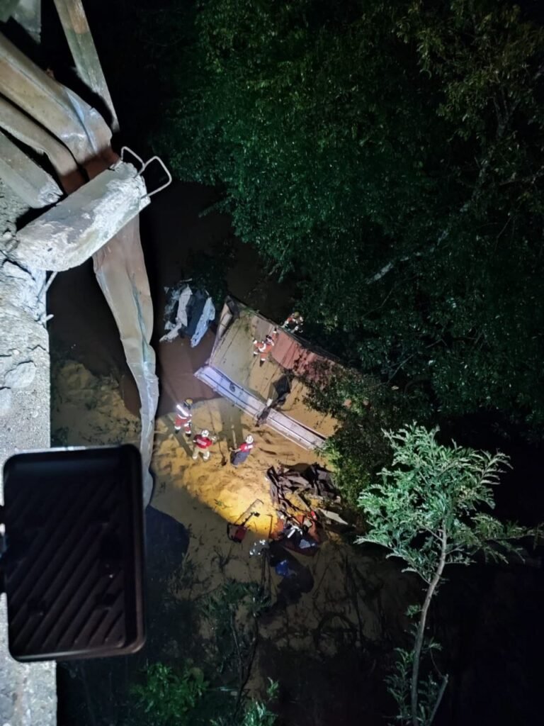 MG: BOMBEIROS ATENDEM OCORRÊNCIA DE CAMINHÃO QUE CAIU DE PONTE NA BR-365, CORPO DA VÍTIMA ESTÁ DESAPARECIDO