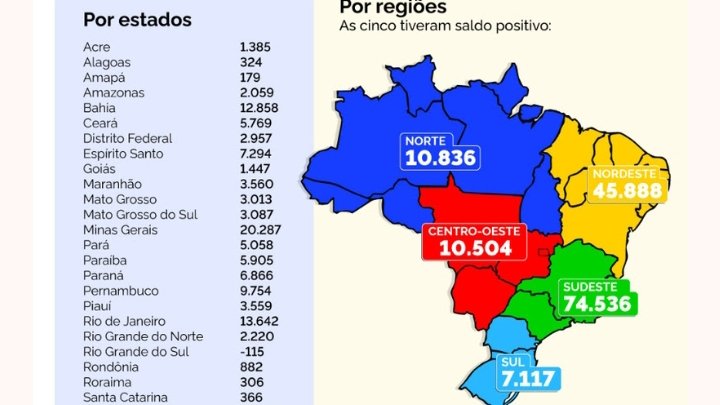 ESTADOS – Entre os estados, os maiores geradores de emprego foram São Paulo (+33.313), Minas Gerais (+20.287) e Rio de Janeiro (+13.642). O maior crescimento relativo ocorreu no Acre, com variação de 1,24%. O saldo negativo foi verificado apenas no Rio Grande do Sul, com -115 vagas de emprego em maio.