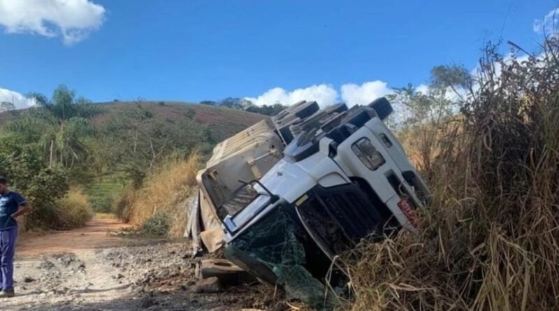 Motorista dorme ao volante e tomba com carreta carregada de escória na MG-329; ‘Pensei que cairia em cima da minha filha’, diz moradora
