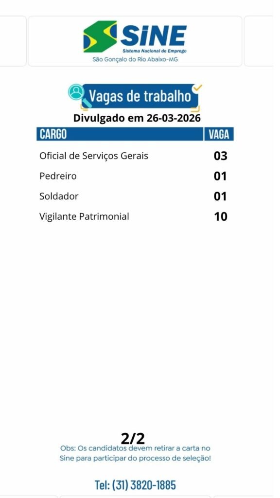 Internacional Muitas vagas de emprego no SINE São Gonçalo do Rio Abaixo para hoje (26/03). Boa sorte aos candidatos. 26 de março de 2026 portaldomediopiracicaba@gmail.com Redação