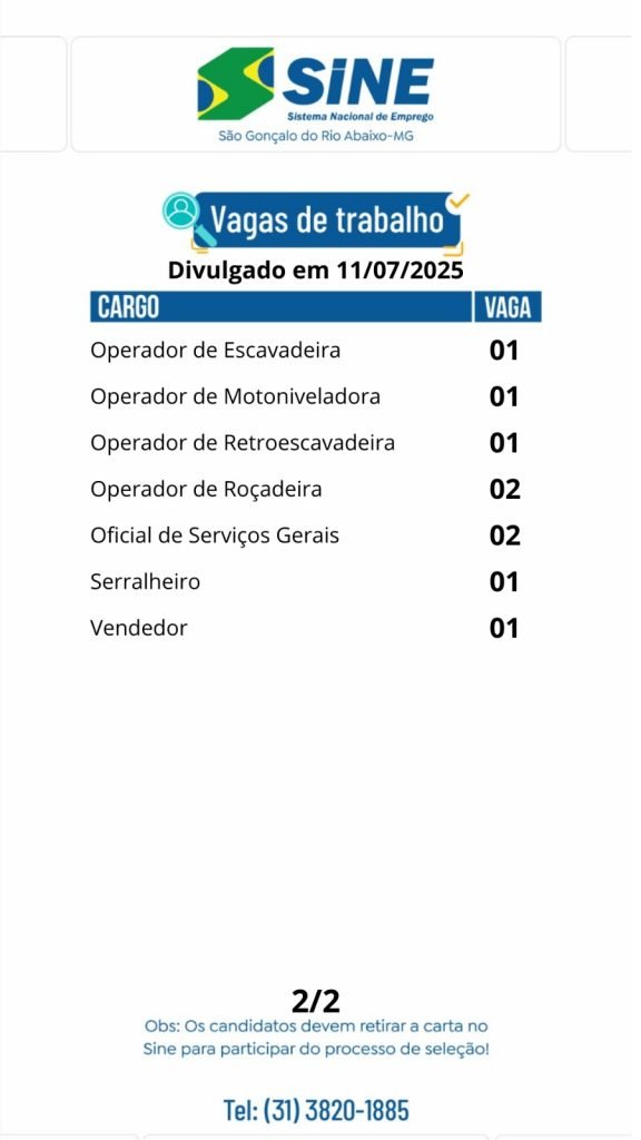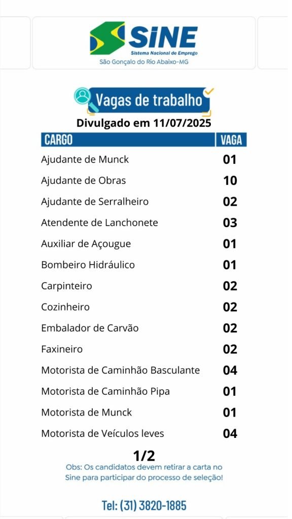 GeralMédio Piracicaba Muitas vagas de emprego para está sexta-feira (11/07) no SINE São Gonçalo do Rio Abaixo (boa sorte aos candidatos) 11 de julho de 2025 portaldomediopiracicaba@gmail.com Redação