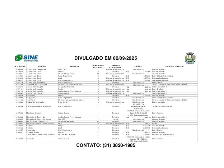MUITAS VAGAS DE EMPREGO PARA HOJE NO SINE SÃO GONÇALO DO RIO ABAIXO, VAGA ESPECIAL ESPECIAL PARA TÉCNICO DE SEGURANÇA (#COMPARTILHE)