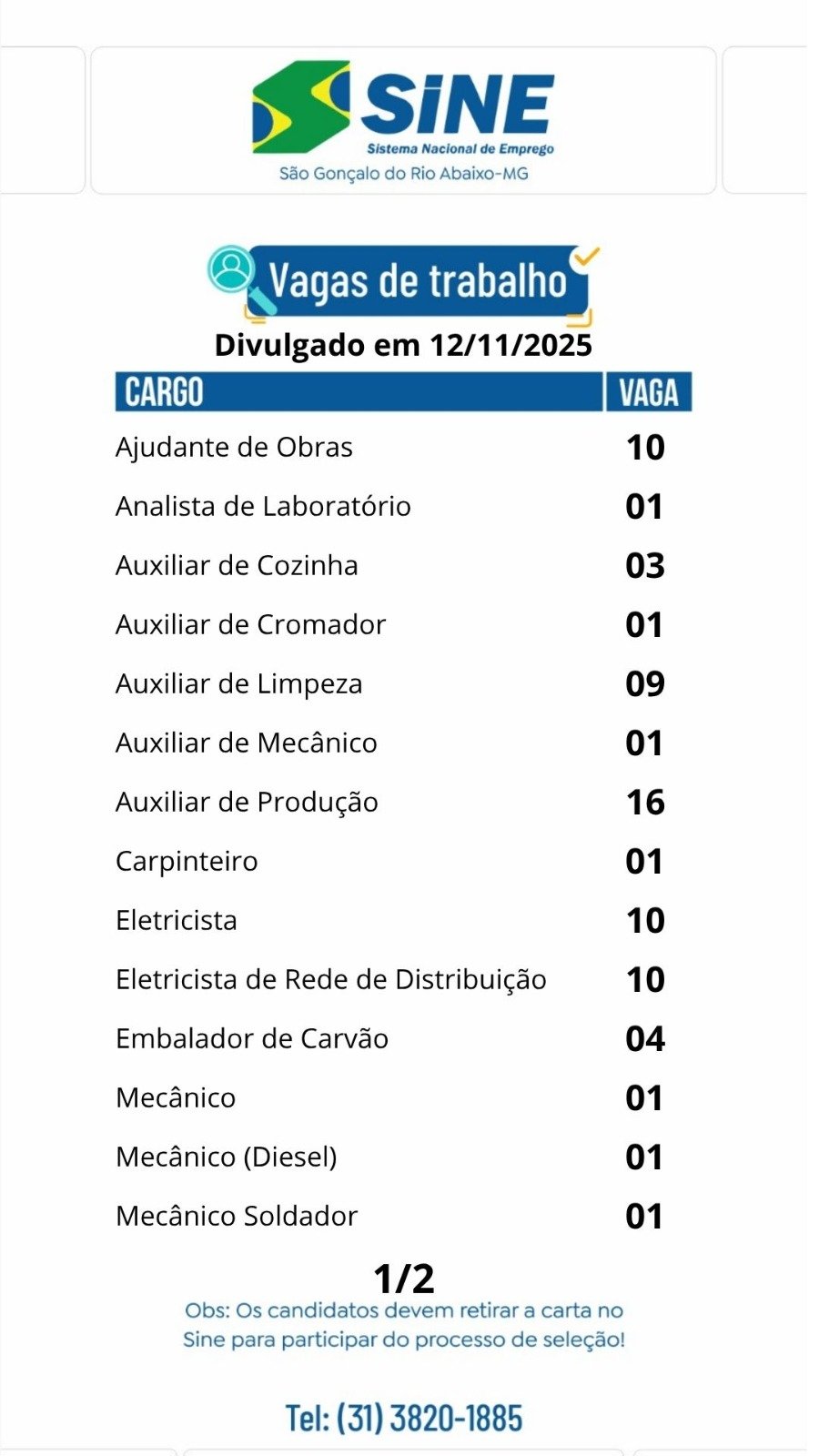 Médio Piracicaba Muitas vagas de emprego para hoje quarta-feira (12) de novembro no SINE São Gonçalo do Rio Abaixo (Boa sorte aos candidatos) 12 de novembro de 2025 portaldomediopiracicaba@gmail.com Redação
