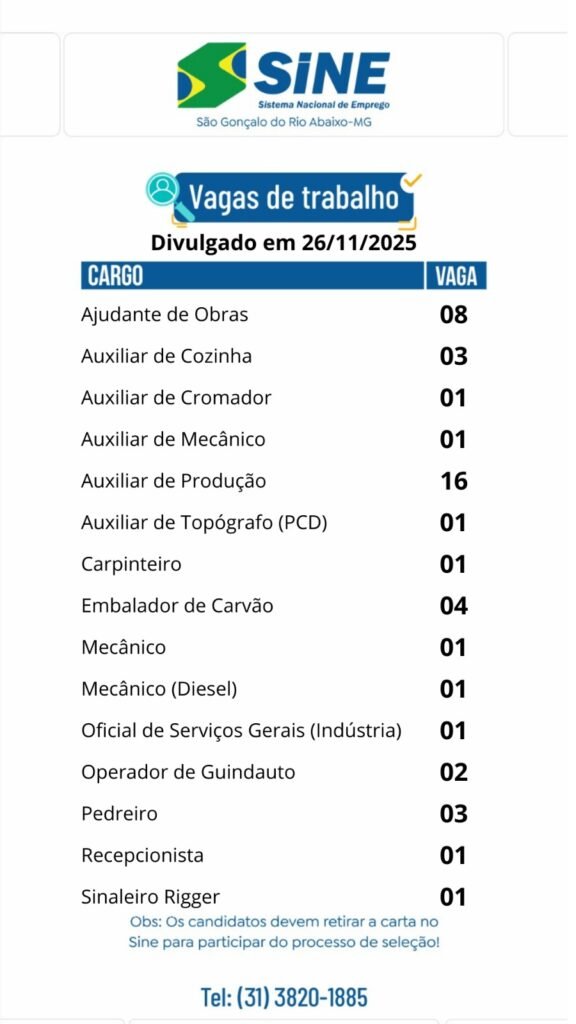 Médio Piracicaba Muitas vagas de emprego para hoje quarta-feira (26/11) no SINE São Gonçalo do Rio Abaixo @boasorteaoscandidatos 26 de novembro de 2025 portaldomediopiracicaba@gmail.com Redação