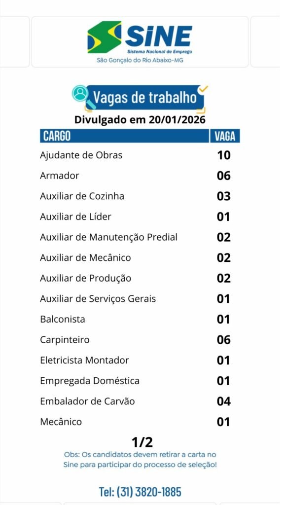 Médio Piracicaba Muitas vagas de emprego para hoje, terça-feira (20) de janeiro no SINE São Gonçalo do Rio Abaixo (Boa sorte aos candidatos) 20 de janeiro de 2026 portaldomediopiracicaba@gmail.com Redação