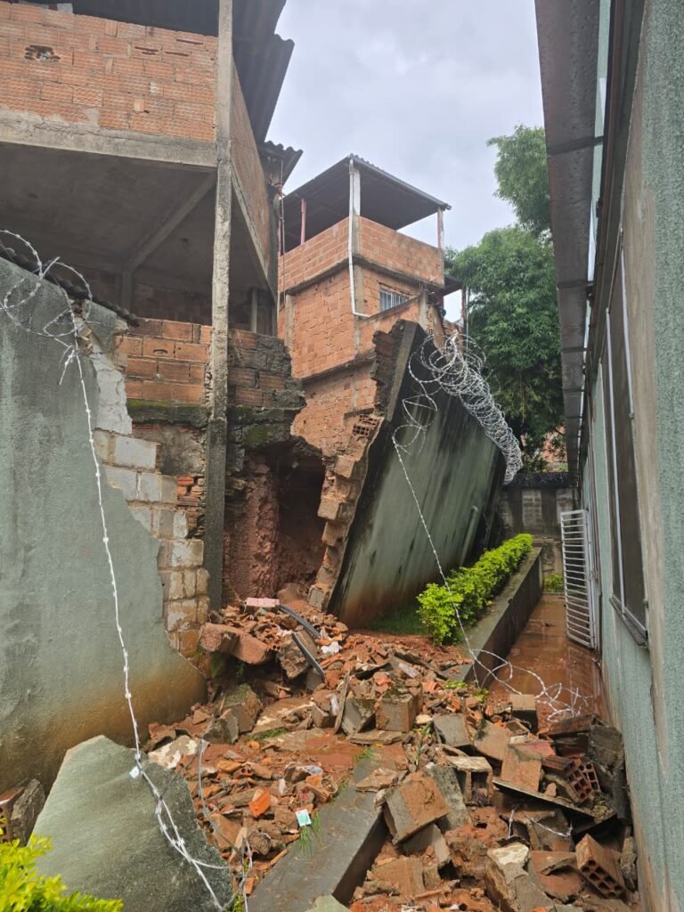Devido às chuvas (conforme relato), um muro com cerca de 3 metros de altura, que pertence à casa ao lado do refeitório da unidade hospitalar, estaria com risco de queda.