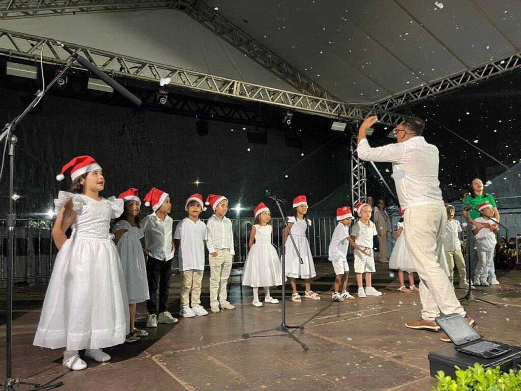 Encerrando as apresentações, os alunos da Escola Municipal de Tempo Integral Maria de Lourdes Duarte Moreira dos Santos, regidos pelo professor Marcelo Hautequeste, cantaram “Terra Seca”, “Feliz Natal (Carrossel)” e “Santo Pra Sempre”, finalizando a noite com mensagens de fé, paz e gratidão.