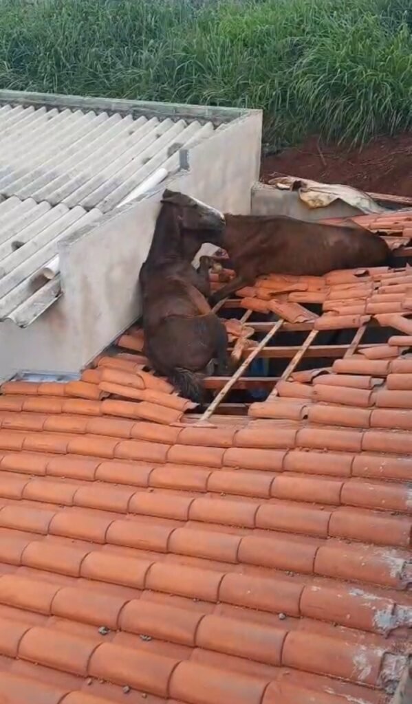 Chegando no local, os bombeiros visualizaram dois cavalos presos pelas patas no telhado da varanda de uma residência. Os animais teriam acessado o local por um lote vago na lateral, que possuía a mesma altura do telhado.