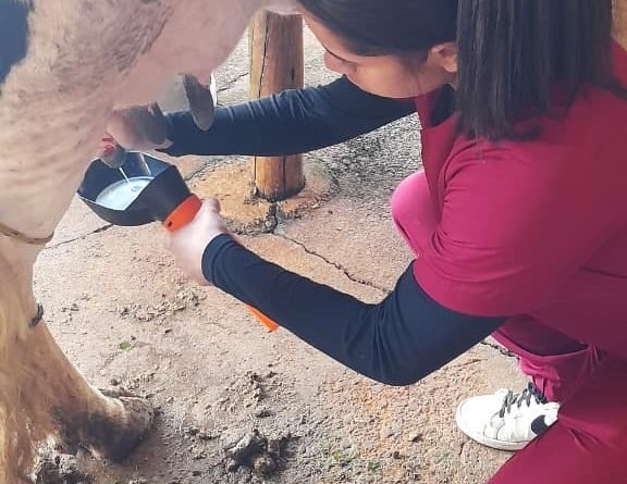 A primeira aula prática ocorreu na última semana, quando estudantes realizaram testes de mastite antes da primeira ordenha do dia, utilizando o CMT e a caneca de fundo preto. Além da aplicação dos exames, os alunos orientaram os produtores rurais sobre o uso correto dos métodos, promovendo capacitação direta no campo.
