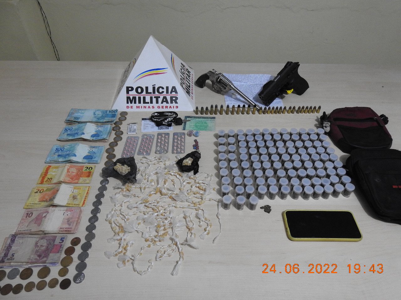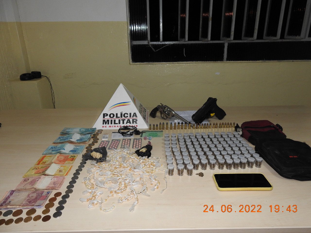 290 pedras de craque doladas e 2 porções de craque; 17 comprimidos de êxtase; 01 pistola calibre 9mm carregada com 15 munições do mesmo calibre; 01 revólver calibre.38 com 11 munições do mesmo calibre; e 01 munição calibre .32. Além de mais de R$3.300,00 em dinheiro e outros materiais de origem duvidosa.