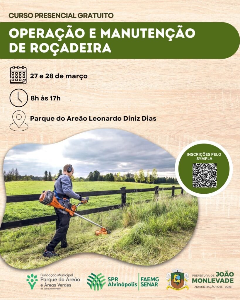 A Prefeitura de João Monlevade, por meio da Fundação Municipal Parque do Areão e Áreas Verdes, em parceria com o SPR Alvinópolis e o Sistema FAEMG/SENAR, realiza nos dias 27 e 28 de março o Curso Presencial Gratuito de Operação e Manutenção de Roçadeira. A capacitação será das 8h às 17h, no Parque do Areão Leonardo Diniz Dias.